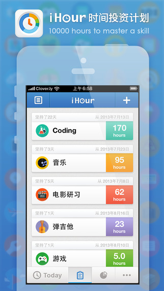 「iHour·时间投资计划」是一个帮助你规划、记录自己时间投入的 app,可以帮助你记录「背单词多少小时」「练琴多少小时」「看书多少小时」「Coding 多少小时」等需要时间累积来提高的技能。特有每日定时提醒,事件正倒数计时器,支持长达 10 年的时间规划。特别设计的成就系统,帮助你突飞猛进。