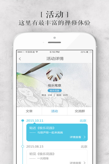 甲和灯app是一款关于佛学文化交流的手机软件,在当今的社会中,越来越多的人开始对佛学感兴趣,而甲和灯是一个非常专业的佛学文化交流与学习的一个平台,你可以在这里与其他佛学爱好者进行交流,探讨,分享各自的观点,使更多的人越来越了解佛学文化,同时在这里还可以参加禅修活动,以禅的态度让生活焕然一新。