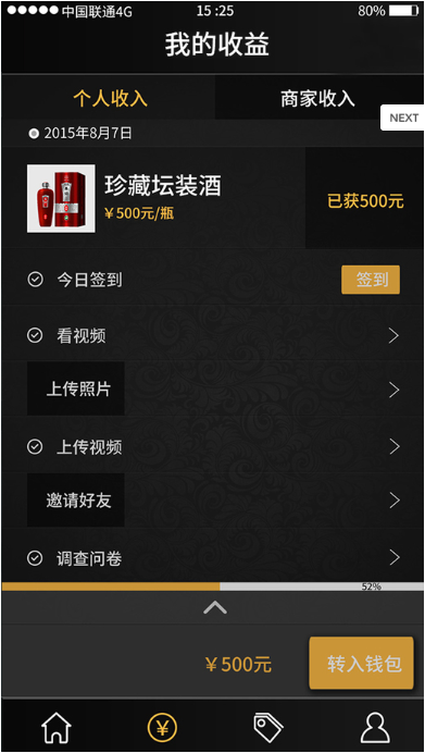 喝酒赚取收益——用户参与活动可赚取相关收益,收益将分期转入钱包,可在平台上抵现,并支持提现至支付宝和微信钱包。