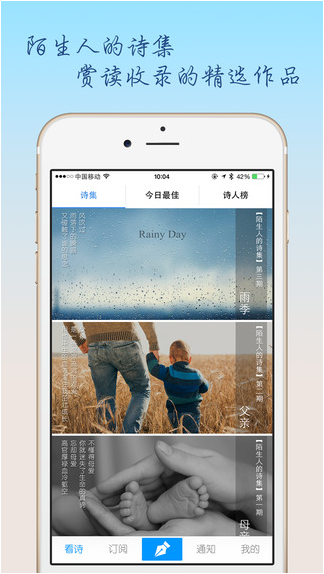 陌生人的诗,是一款以写诗、看诗为主的原创社交应用。通过欣赏、交流从而以诗会友,也可以给自己的写作水平带来提高。不限内容,不限诗体,不限形式,只用文字记录生活、感悟或是梦境。 目前已有上万首原创诗词,用最简单的一字一句打动你。