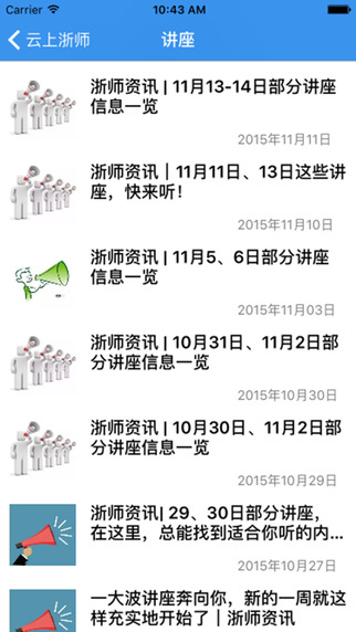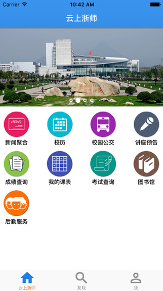 3.校内资源聚合:整合了丰富的校内信息,实用的便捷服务,包括校历,校园公交,讲座预告,成绩查询,考试安排,课表,图书馆,后勤安排等。