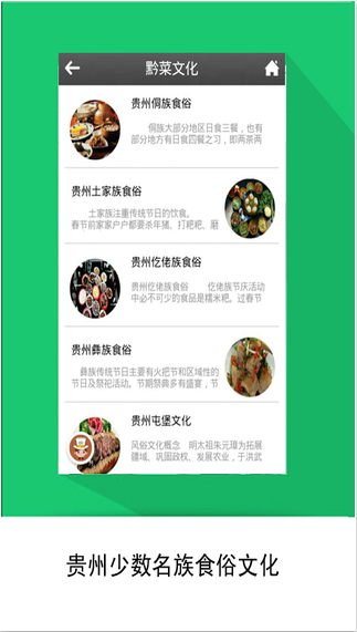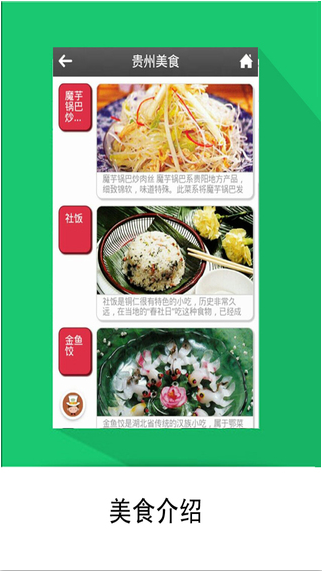 贵州美食是一款餐厅推荐的移动端,贵州美食是美食爱好者必备的神器,它聚集了贵州各地的美食及餐厅;还有美食制作,让你在家都可以轻松想用美食。贵州美食是一款讲述贵州饮食文化的软件,烹调精湛,菜式繁多,格局美观,具有辣、酸、香、鲜、野风格特色。你喜欢贵州吗?你想要了解贵州美食吗?那还等什么,抓紧下载吧!!!
