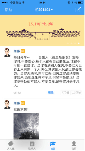 1、校园动态:浏览、发布、评论校园动态,文字+图片