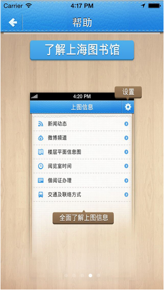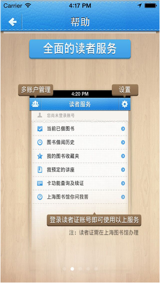 通过条码扫描可以方便的查询上海图书馆是否有图书的馆藏。读者服务,包括已借图书查询及自助续借,个人借阅历史查询,卡功能查询以及我的收藏等功能。