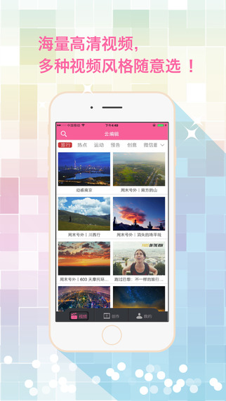 云编辑app内有海量精美优质视频,让你大开眼界畅游世界,云编辑app还支持一键缓存,随时用于你的视频创作编辑。拍摄原视频,制作相册MV,剪辑缓存里的云视频,多种功能供你随意进行灵感的挥霍。