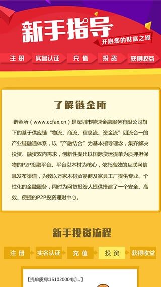 链金所(www.ccfax.cn)是基于供应链“物流、商流、信息流、资金流”四流合一的产业链融通体系,以“产融结合”为基本指导理念,集齐解决投资、融资双向需求,创新性提出以国际货运提单为质押担保物的P2P投融平台。平台以木材为核心,依托高效的互联网信息发布渠道,为数以万家木材贸易商及家具工厂提供专业、个性化的金融服务,同时为网贷投资人提供搭建了一个安全、高效、便捷的P2P投资理财中心。