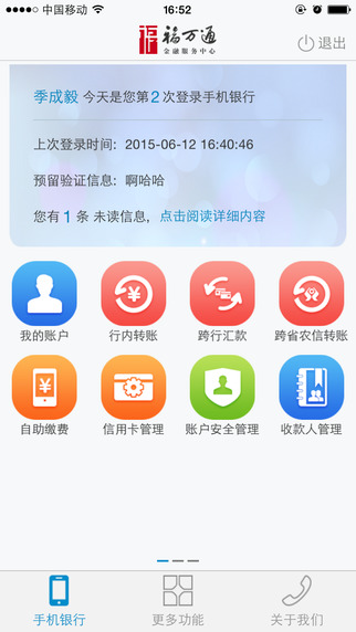 手机银行系统共有4项大功能、20余项子功能,为客户提供账户管理、交易查询、行内转账、跨行转账、电力缴费、手机充值等金融服务,满足您的移动金融需求。