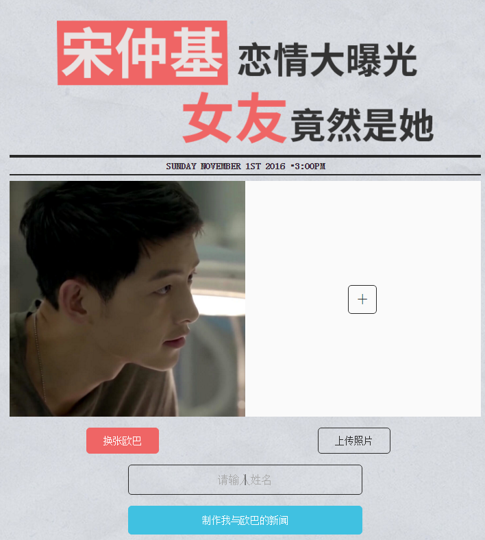 根据自己上传的名字及照片就能将新闻里变成你的照片与名字哦,常人根本无法看出来啊,简直太装逼了,喜欢宋仲基的朋友快来玩玩吧