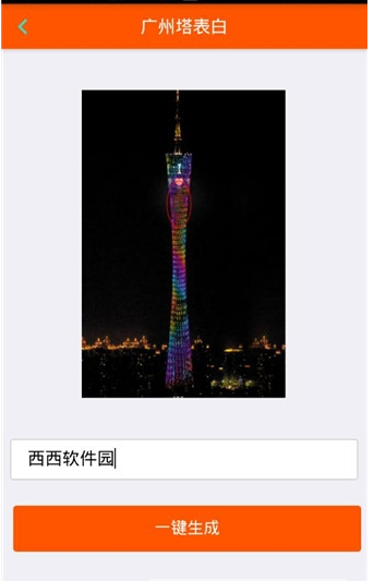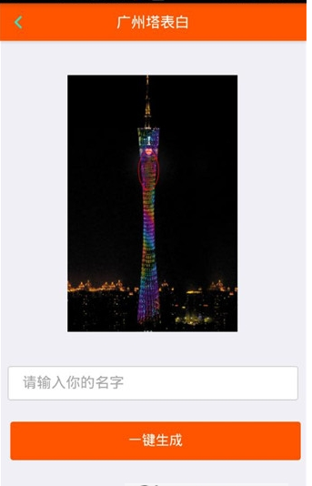 广州塔表白生成器手机软件是一款之前非常火的表白神器,你是否还在羡慕高富帅可以在广州塔上表白?现在有了广州塔表白神器,免费帮助你实现愿望哦,赶快来想你喜欢的人表白吧!