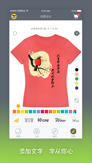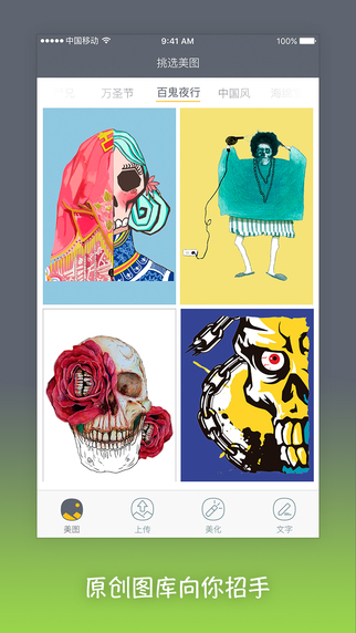 1、操作便捷、创意百变:上传自己的照片或选择我们原创的多主题美图,都支持图片在线优化,让你的创意美美的;