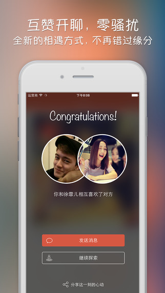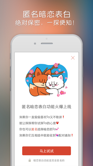 这个软件是刷脸的,按照系统的设计,只有相互喜欢的人(也就是有眼缘的人)才能开始对话。其他人是无法给你发送信息的。我觉得最有意思的是系统弹出“恭喜,你跟xxx已相互喜欢”那一刻,尤其是和喜欢的人配对成功,还是有点怦然心动的。还在一味的向附近的人Say hi么;还总是被陌生的人骚扰么。快加入探探,在滑动中找到你的缘分,没有复杂的操作,没有频繁的骚扰。一切,就这么简单。