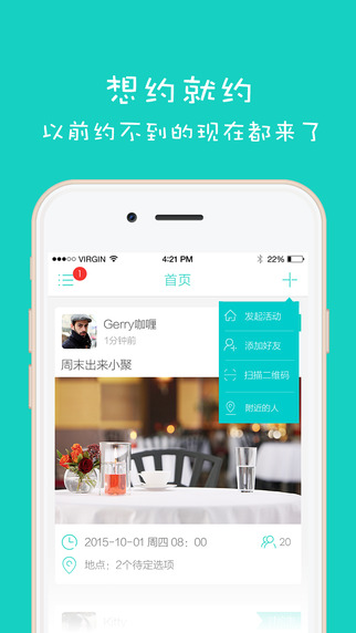 想聚会?找只约。只约帮助你将社交想法转变为现实活动,提供一目了然的活动信息、简易化的活动决策过程与全新的活动历程。