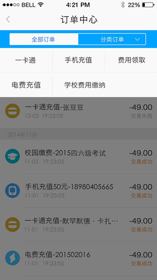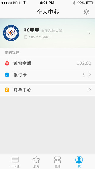 4 丰富:支持一卡通充值,挂失,消费明细查询以及话费缴纳,服务多样化,让生活丰富多彩;