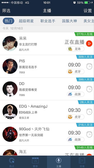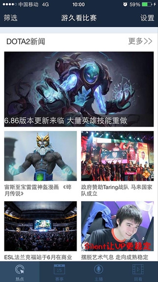 游久看比赛iPhone版是由著名的游戏资讯网站游久网推出的一款电竞赛事在线观看app,app内包含了dota2,DOTA,LOL,风暴英雄等主流电竞游戏的赛制直播,app在提供视频直播的同时,还可以发送弹幕,非常方便广大玩家,让你随时随地获取所关注比赛的现场报道。