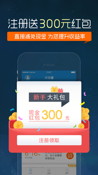 ·300元现金红包:成功注册洋钱罐理财即可免费领取300元现金红包;