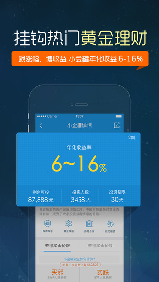·小金罐:年化收益最高16%,与黄金期货(AU1606)挂钩,保本+浮动收益,在保障本金的前提下追求高收益的回报;