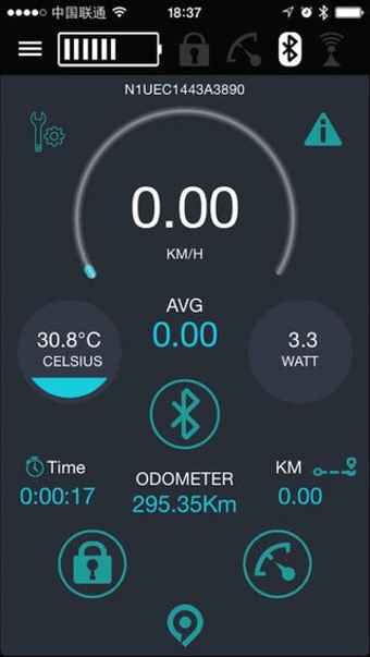 “仪表盘”页面能够显示车辆当前的行驶速度、里程、温度、骑行时间,同时还能进行开启/关闭引擎、锁车、解锁等操作。