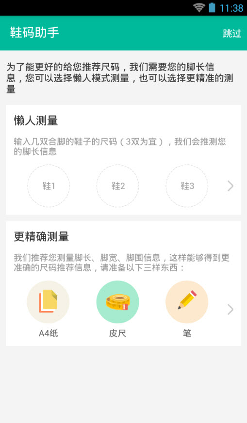 首次打开时需要选择性别,选择脚的测量模式,目前App提供精确测量和懒人测量两种模式。精确测量指,如果有方便测量的工具(如皮尺、A4纸、笔等),可使用精确测量模式录入脚长、脚宽等信息。懒人测量指,在没有测量工具的情况下,录入现有鞋子尺码,App将据此推测脚长信息。此后,在再次挑选品牌鞋履时,即可使用鞋码助手推荐的对照表选择适合自己的尺码。