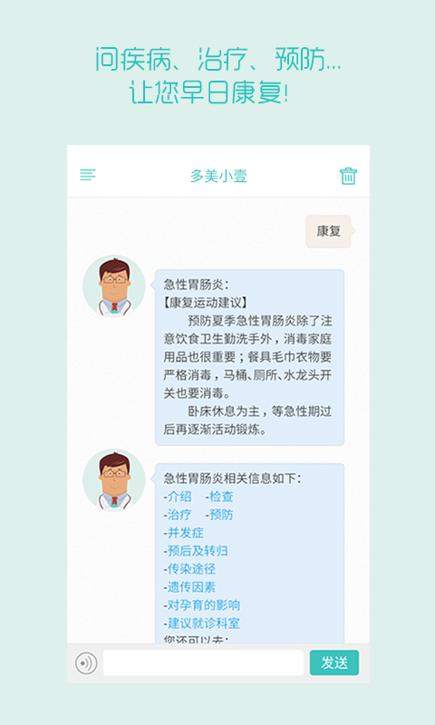 「大白」是一个遥不可及的幻想,但拥有一位贴心的私人健康顾问却不难。「多美小壹」就是一只专注于解答健康问题的聊天「机器人」。你只需要将你的症状告诉小壹,他就会立刻开启「诊断」模式。在对话中不断对个人信息及病症进行完善,最终「确诊」。小壹会清楚地告诉你疾病的起因、病症以及防治措施。你还可以跳转到壹健康预约医生或是与病友交流。