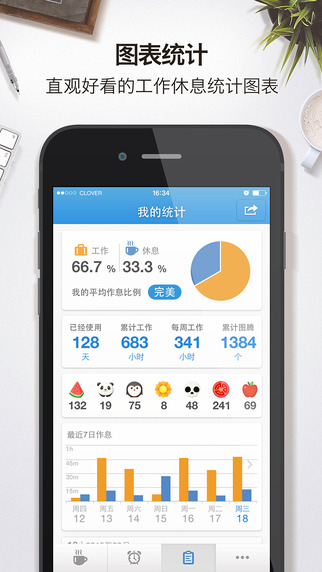 3、图表统计:直观好看的工作休息统计图表;