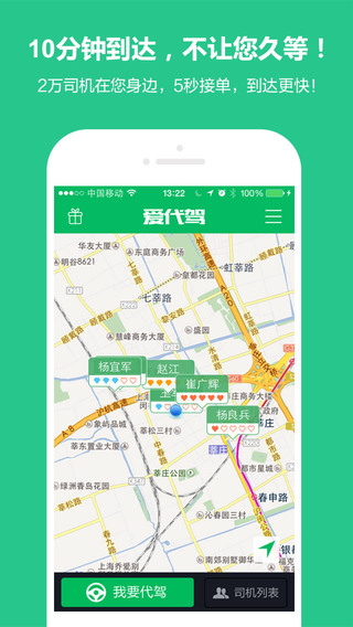 爱代驾拥有超过2万名司机队伍,在开通业务的13个城市,无论何时何地,打开爱代驾APP,2公里范围内至少有5位司机供你选择。另外,2公里内10分钟到达提供服务,是爱代驾司机必要条件之一。