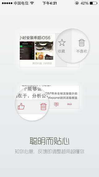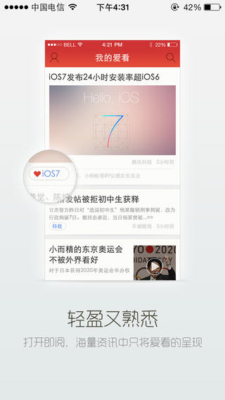 “知心懂你,悦读越爱看”,2015专为iOS7设计的腾讯爱看,用最简单的方式让你最快遇到感兴趣的内容。
