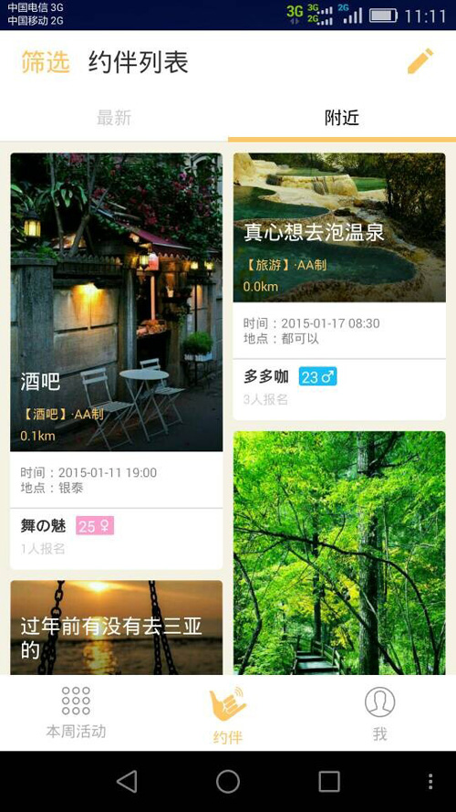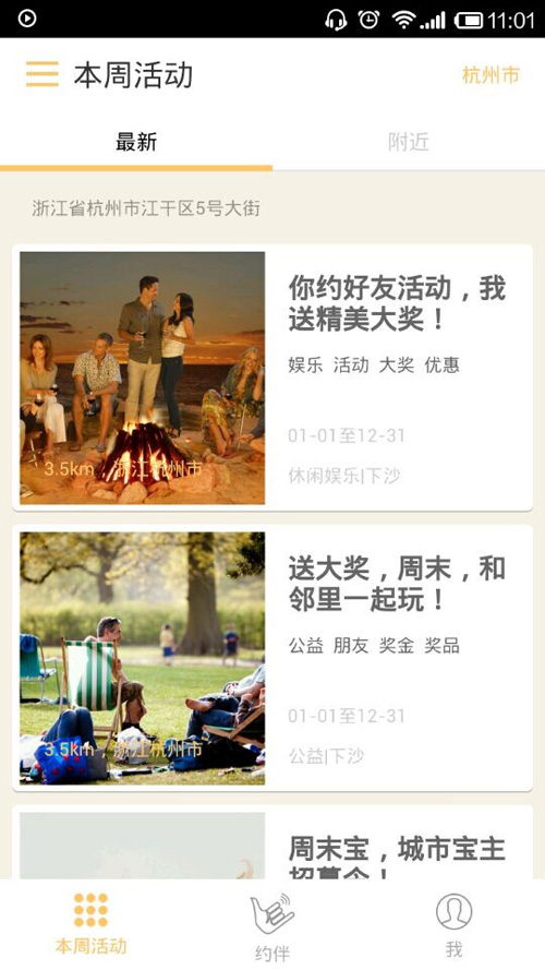 无论你在哪,周末宝能自动定位,轻松查找周边的活动、附近的约伴信息,同时你也能知道自己所在的精确位置。