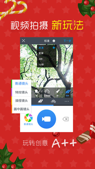 - 多种拍摄镜头更好玩:画中画镜头、特效镜头、搞怪镜头、音乐镜头;