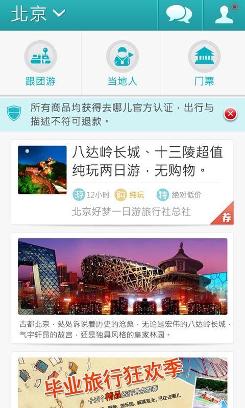 《去哪儿当地》是去哪儿网旗下的当地旅游比价预订平台,主要帮您解决到达目的地之后的旅游线路选择及预订问题。用户使用“去哪儿当地”客户端可以查询、预订各大热门旅游城市的1日游、2日游及周边旅游产品。去哪儿当地致力于通过公开透明的产品展示以及搜索比价功能,让您直观辨别当地游产品的优劣,力求帮助您查询预订当地旅游线路,远离乱购物、乱收费等旅游陷阱,享受愉快的旅游体验。