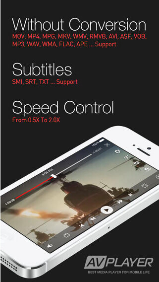 AVPlayer播放器一个可以播放任何格式的媒体播放器。提供清晰的画质,播放流畅度可达到数倍于同类型所谓全功能播放器。Avplayer手机版是一款功能非常强大的视频播放器,是用Safari播放之外的好选择。系统能支持的格式都行(audio, video, seeqpod, mxtube,, mp4, m4v, 3gp, mp3)。最大好处:可以看任意目录的媒体文件。此程序需与Mobile Finder一起使用,可以支持iPhone本身播放器能识别的媒体文件。程序没有什么界面,但是在桌面有一个图标,点击直接观看上次的视频。文件路径,文件名称都不行出现中文名,否则进入后就是黑屏。