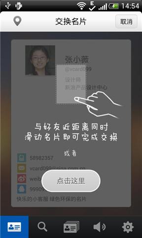 近距离滑动屏幕就能与好友完成名片交换和微博互粉;