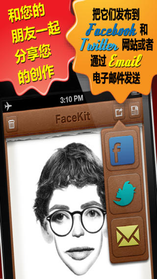 现在您可以用 FaceKit 来自创您朋友的脸了, 并且可以把他们分享到 Facebook 和 Twitter 网站。 男士还是女士? 您可以把他们的脸改成滑稽的或大或小, 秃顶或者长发, 可笑或者令人毛骨悚然, 随便您, 这全看您高兴怎么玩了, 这真是无穷无尽的乐趣啊!