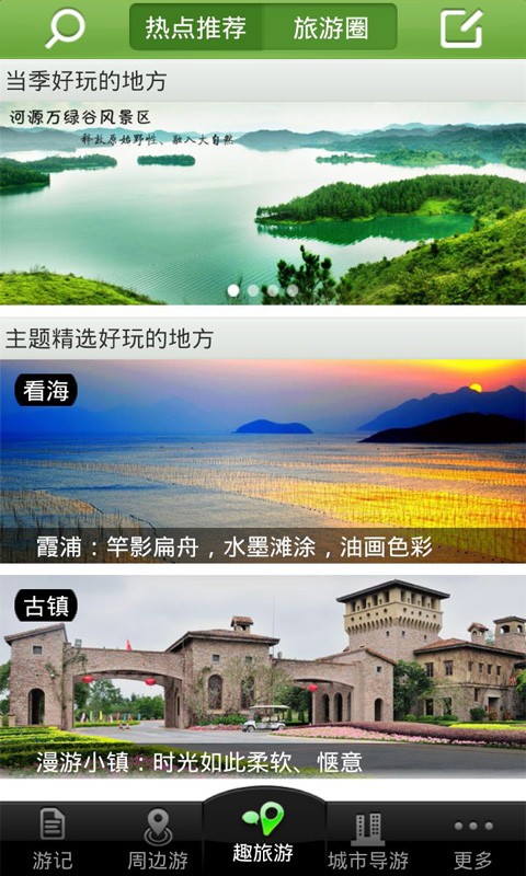 趣旅游--国内首款旅游休闲LBS手机应用,是一款好用的旅游App手机旅行软件,涵盖当季游、周边游、旅游攻略、城市导游、当季游、美食攻略、精彩游记等实用信息,是您外出行旅游的必备手机旅行应用。