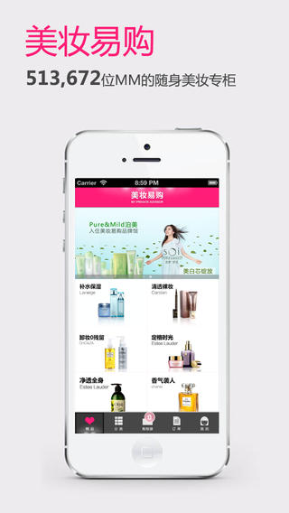 美妆易购---我的iOS美妆专柜 2012年,美妆易购,这款原本应女友要求而设计的小软件,凭借良好的用户体验(无需注册、货到付款)、贴心的服务,迅速获得了50万MM的喜爱 2013年,美妆易购,将会以更给力的商家、更给力的用户体验、更给力的服务呈现给百万MM们------