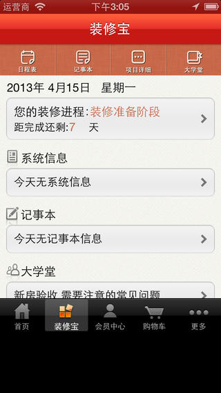 5.根据用户设定的装修项目,自动制定项目进程,有序推送日程提醒,让用户装修省心无忧!