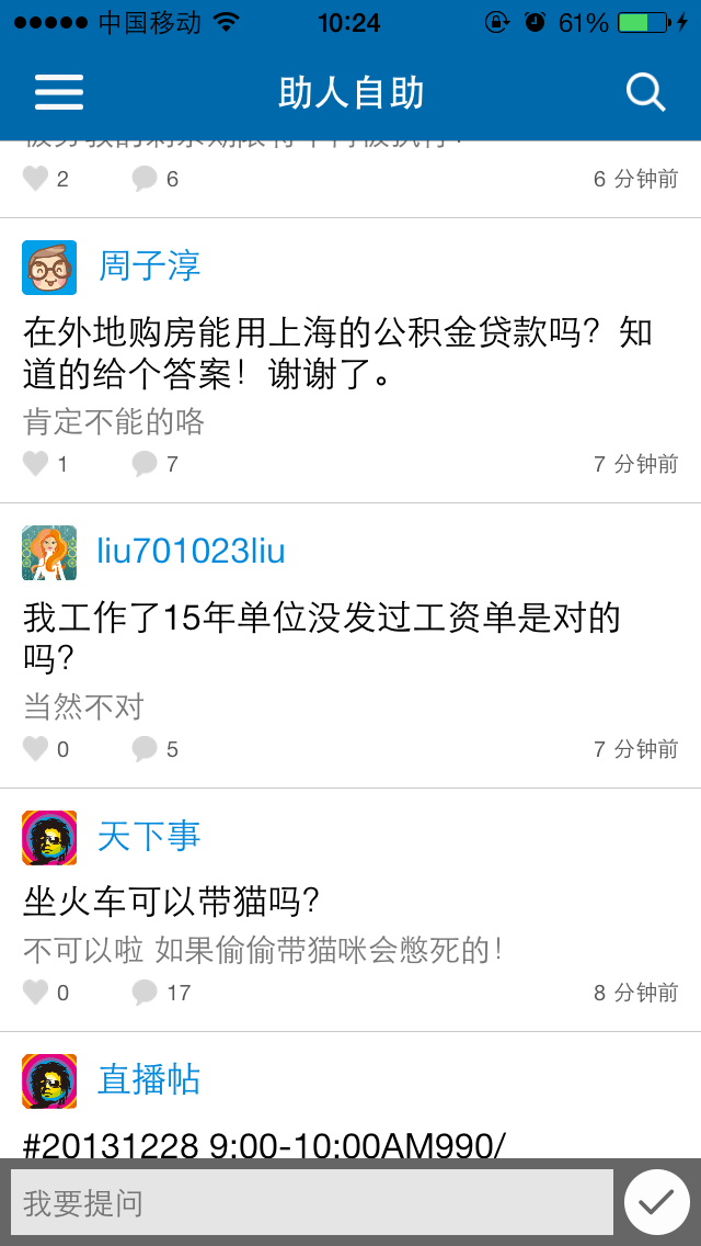 如果您关心的问题暂时没有查询到,没关系,您可以在本软件“助人自助”版块发帖求帮助。一石激起千层浪,只要您的问题一经发布,立即就会被无数的网友、政策专家关注,并给出建议和解答。