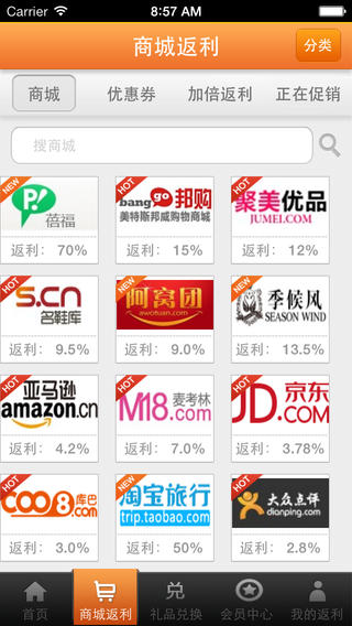 1.快速搜索各大返利的商城和淘宝店铺 丰富的返利商城优惠券、加倍返利、限时抢购、正在促销信息