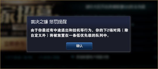 对局结束后玩家返回大厅时会提示玩家剩余惩罚场数。