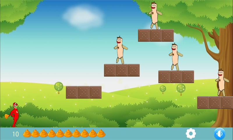 大便大战是一款非常适合小孩子玩的游戏,它的操作十分简单,只需要按住屏幕调整手臂角度松开以后掷出大便就可以了。它是由一个像咸蛋超人的人偶来掷出大便来击倒示威的怪兽,通过逐渐掷出大便将怪兽一一打倒,要记住的是大便的数量是有限的,确保每一个大便都能击倒一个怪兽人偶,这很考验你掷出的角度,高的击倒率,过关的机率就越高。关数越高越刺激喔!等你来闯关,精彩的游戏等你玩。