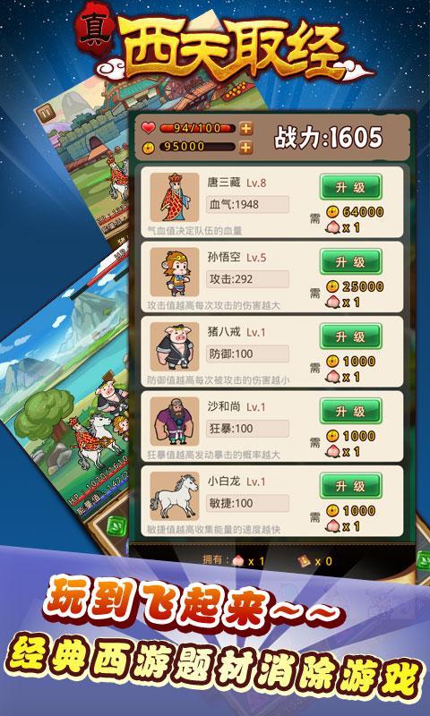 真西天取经是一款经典的西游题材消除游戏,通过唐僧师徒4人西天取经的成长故事与三消游戏模式相结合,创造出简单有趣变换无穷的玩法。