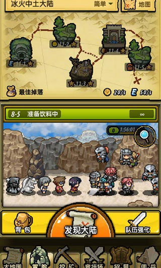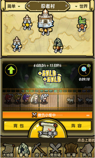 另外,与国内许多产品不同的,当然也是《冒险与挖矿》这个名字的由来,那就是这个游戏的进程由“冒险”与“挖矿”两条线来组成:一方面,玩家在“冒险”中,可以获取关卡中掉落的经验包、钱袋、能力永久提升的道具来获取培养队伍的资源;另一方面,玩家也需要在“挖矿”模式中获取强化角色所需的矿石,两个方向的资源获取或培养共同制约着队伍能力的发展。