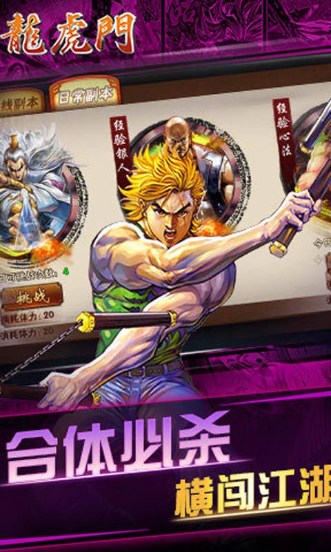 《龙虎门》是一款IP改变的RPG手游。游戏大量植入原著经典漫画插图,让玩家体验到最原汁原味的热血动作范港漫。 独特点触式操作告别卡牌无脑式战斗,超强合体技点触触发、Prefect、Good评价满满格斗范!