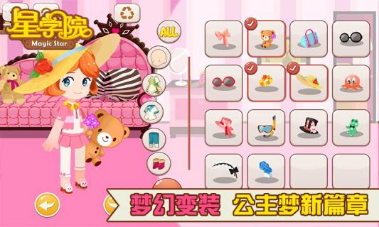 《星学院》手游是以动画片《星学院》的同名手机网络游戏,游戏以装扮、交互为主要玩法的休闲游戏。每个女孩内心都有一个变为公主一样的完美形象的梦想,本游戏以Q版可爱的美术风格,结合独特而紧跟潮流的,多样化的造型、服饰设计,让玩家通过自己的审美来装扮房间和自己的形象,并且可以通过交互系统与其他互动,利用日记系统记录自己的心情和想法并与其他玩家交流。