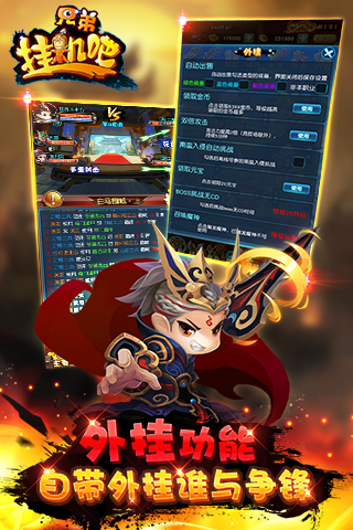 2015划时代挂机手游,自带外挂爽翻天。双倍攻击、召唤魔神、自动索敌、挂机战斗,一键开启根本停不下来!离线也能升级、打怪、爆装备,装备神兵,强化附魔让主公无往不利。更有三国Q将出战助阵,助战技能扭转乾坤。世界BOSS、公会副本、魔神挑战,不挂机时呼朋唤友一起战个痛快。还在等什么!快来一起挂机吧!兄弟!