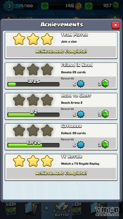 完成成就得到的金币和钻石奖励都是较多的,如加入部落直接得到了100宝石。