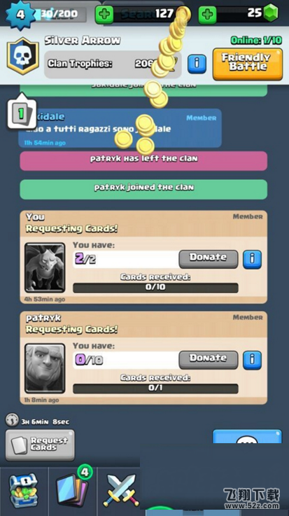 3级加入部落之后,玩家们可以在部落索取卡牌和捐献卡牌,我们这里主要介绍下捐卡,有金币和经验返还(金币不是索求者那里扣除,而是系统发)。