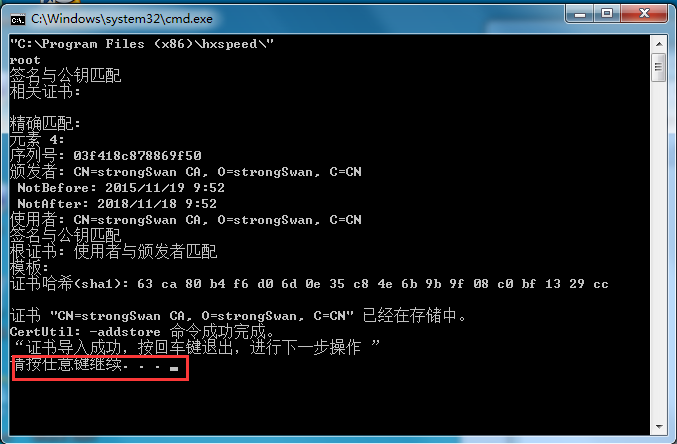 首次安装客户端的用户,会有一个证书导入的窗口,输入任意键继续即可。