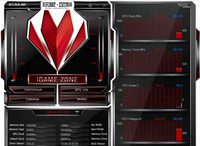 IGAME ZONE的外观风格延续iGame的元素,主题采用iGame 红色VI面具。软件提供4个显卡信息子界面,分别是“Lock/Ulock”超频开关按钮,“Customize”超频调节选项,“GPU info”显卡信息和“Monitor”显卡监控界面。以及“玩家·定制”的右侧是“个性设置”选项,方便玩家更换背景颜色,以及个性头像等。