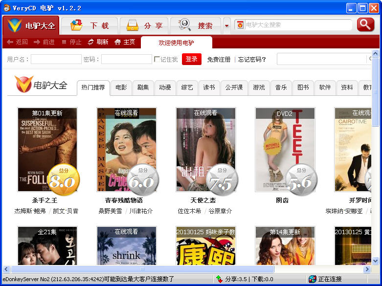 verycd电驴(easymule)是在emule的基础上全新开发的新版本,具有更快的下载和上传速度,更简便的操作界面,以及更多新增的人性化功能,这一切都是免费和开源的 【软件特点】友好界面,使用更简便更直观 最快下载,针对各种网络优化 协议互通,分享网络覆盖全球 保护硬盘,智能优化磁盘缓冲 安全免费,绿色无毒放心下载