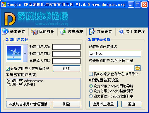 Deepin XP 精简优化设置工具定位于哪些比较偷懒的朋友使用。 这个工具会选择了效果比较明显的优化方式,大多数人只需要选择一下你电脑的使用模式,最多再设置一下服务细节就完成了基本的优化。对已经优化过的系统效果不明显,对新装的系统进行优化效果较好。 这个工具首创对Windows XP系统进行环境模式优化,帮助用户快速进行服务优化而不影响正常使用,同时,能够自动判断内存大小优化系统参数。(对256M以下系统内置特别优化参数),上网痕迹清理、IE故障修复和对XP系统进行快速垃圾文件清理和减肥的功能。